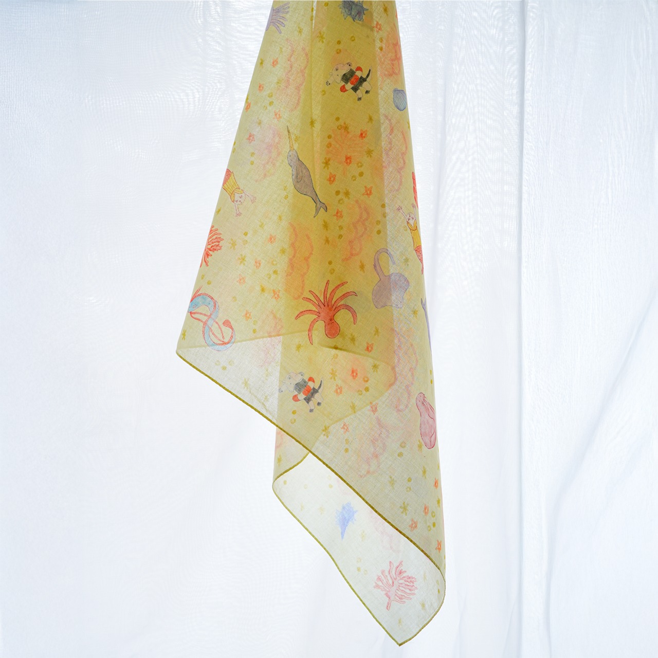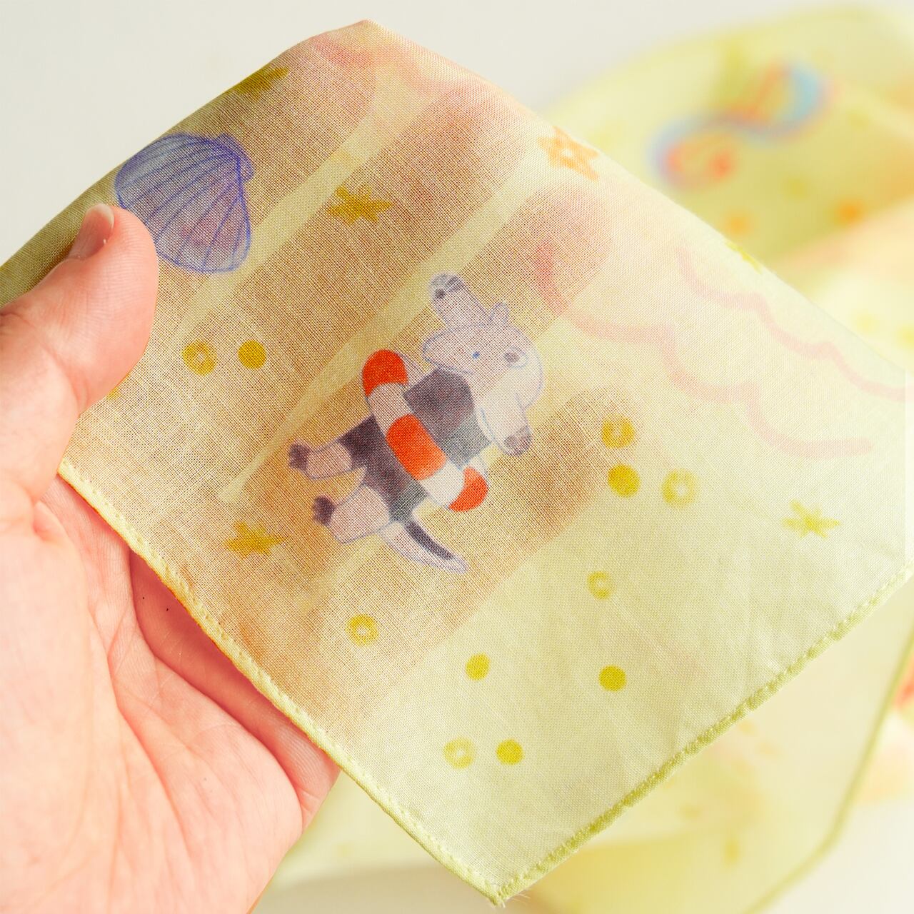 このハンカチスカーフには、通常の綿ローンよりもさらに細い糸を使用しており、首に巻いてもストレスのない心地よさを実現しています。
