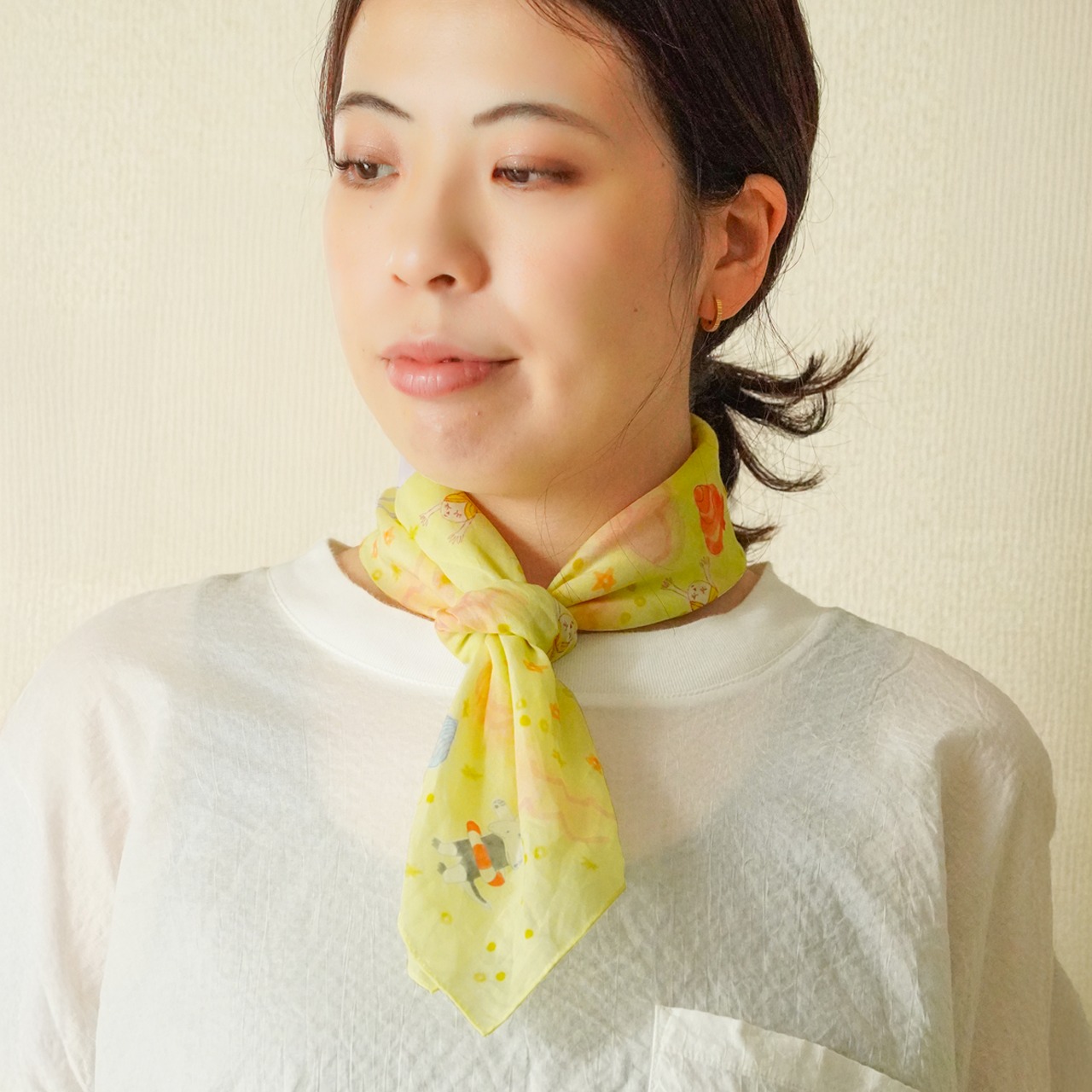 コーディネートのアクセントとしてはもちろん、夏の汗対策にも活躍するハンカチスカーフです。