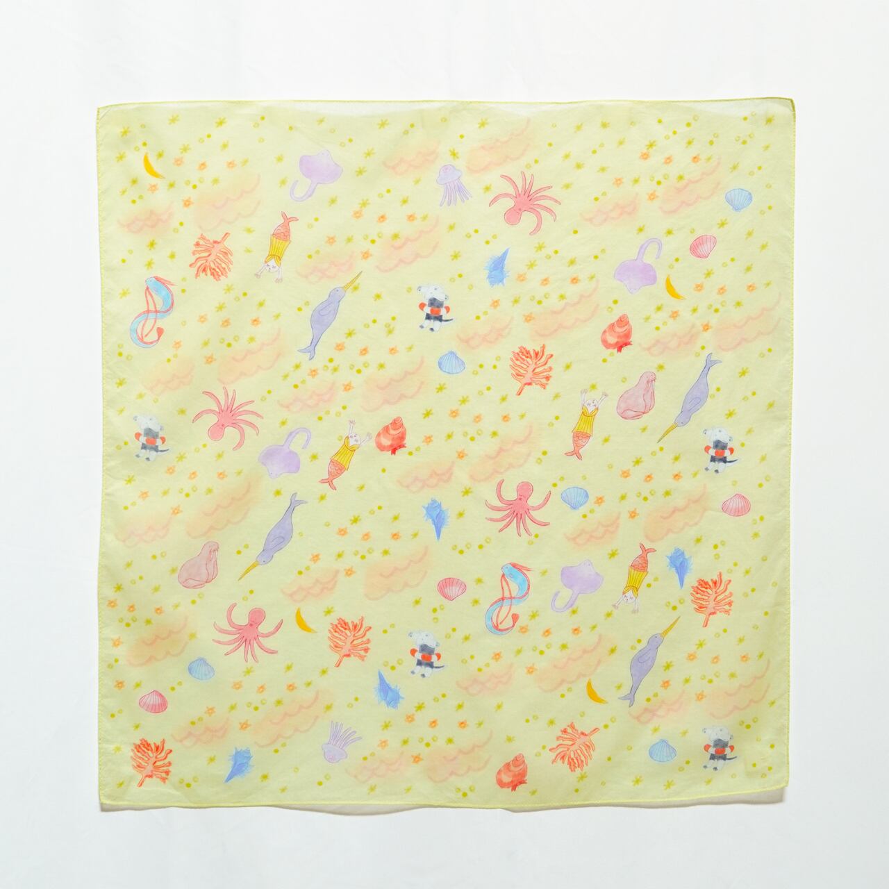 空のように幻想的な海を、個性豊かな海の生きものたちが泳ぐ「白夜の海」柄です。