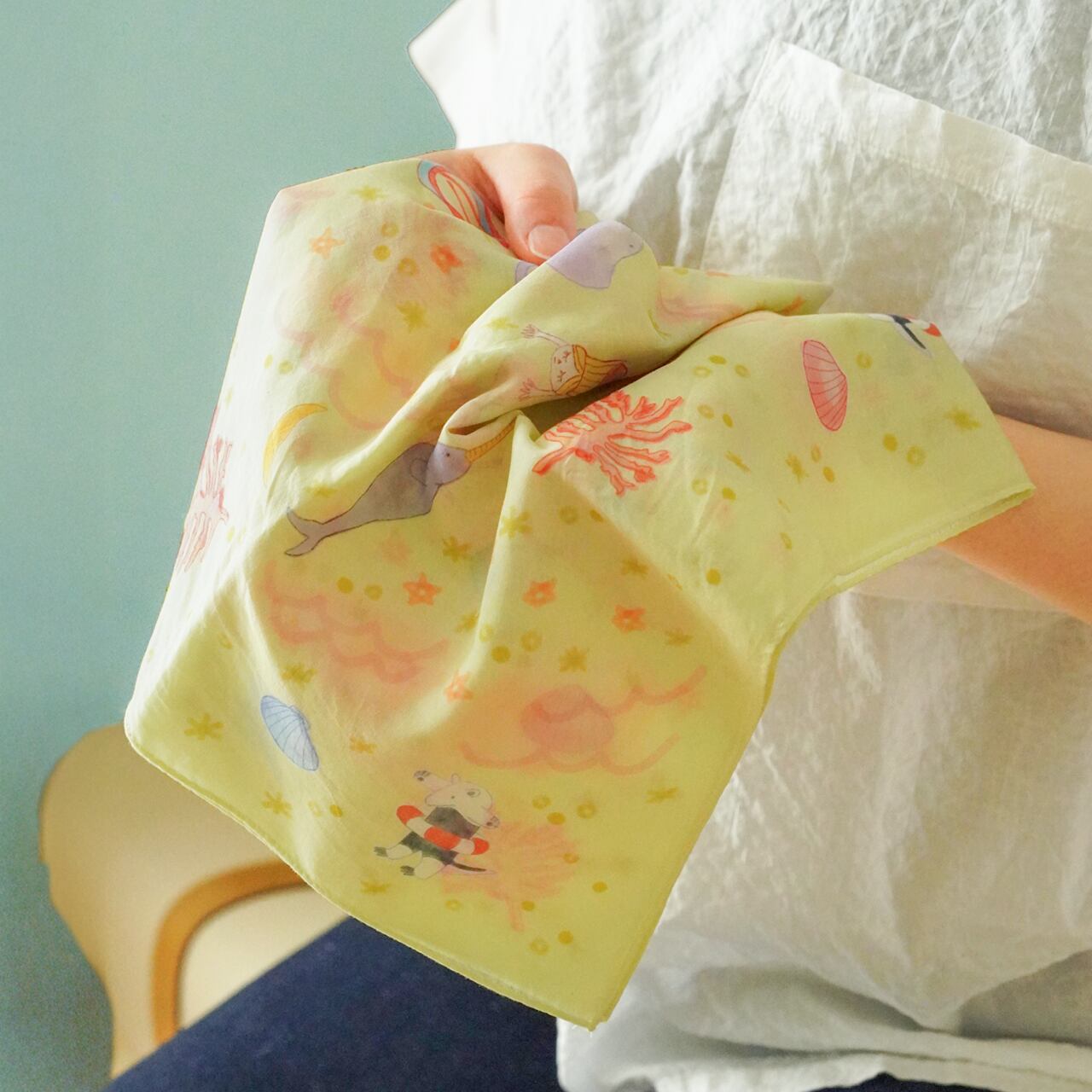 10年以上にわたりスカーフの企画に携わってきた経験を活かし、簡単に形が決まり、真夏でも重たくならず、首元の汗対策にもなるハンカチスカーフを作りました。