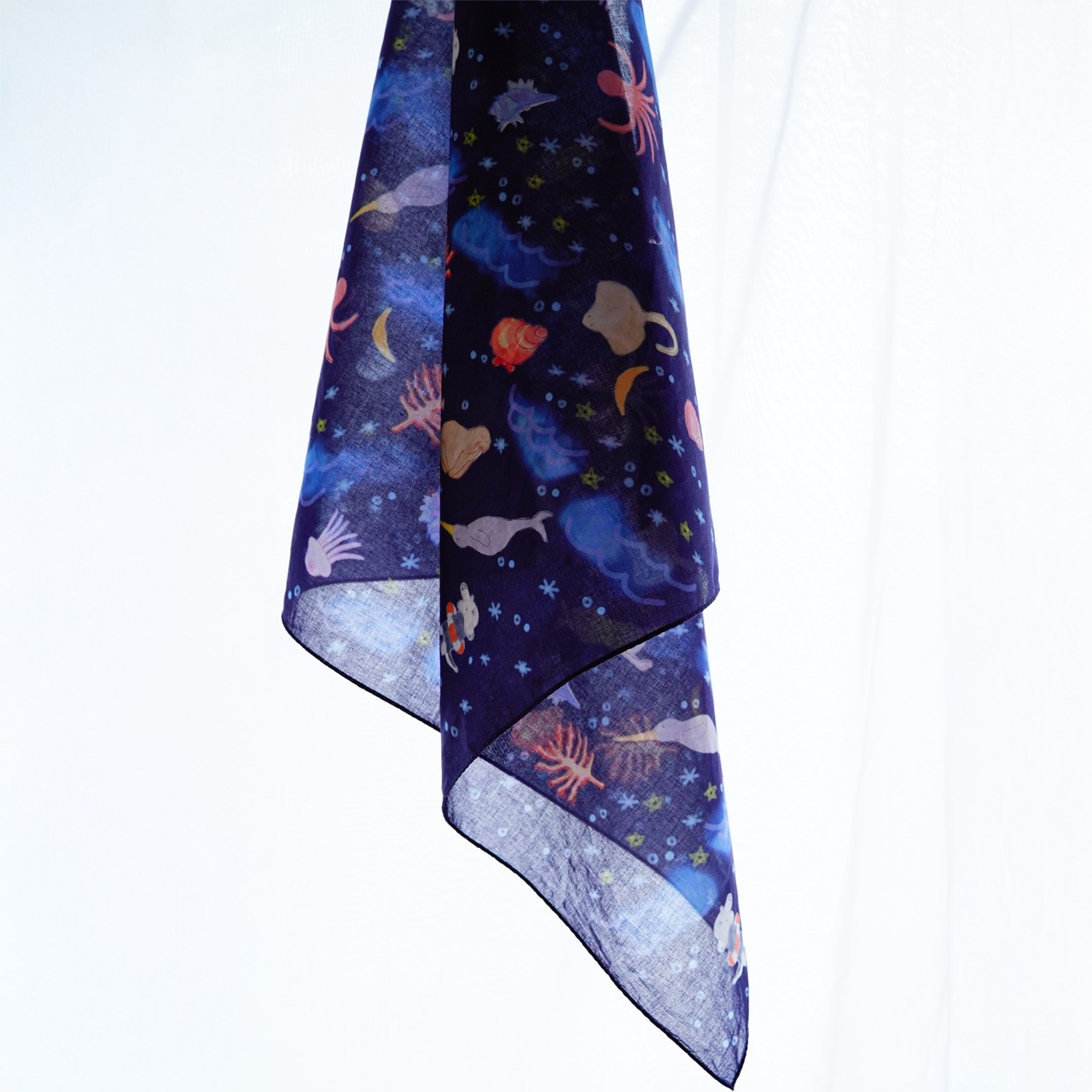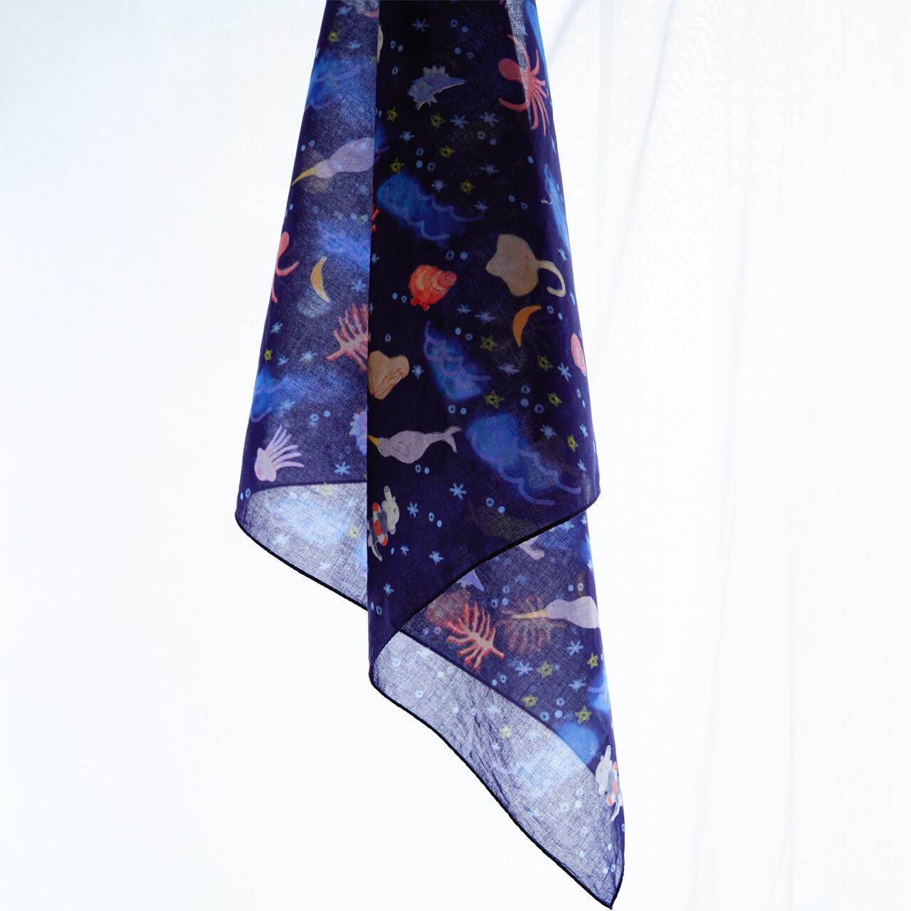 空のように幻想的な海を、個性豊かな海の生きものたちが泳ぐ「極夜の海」柄。