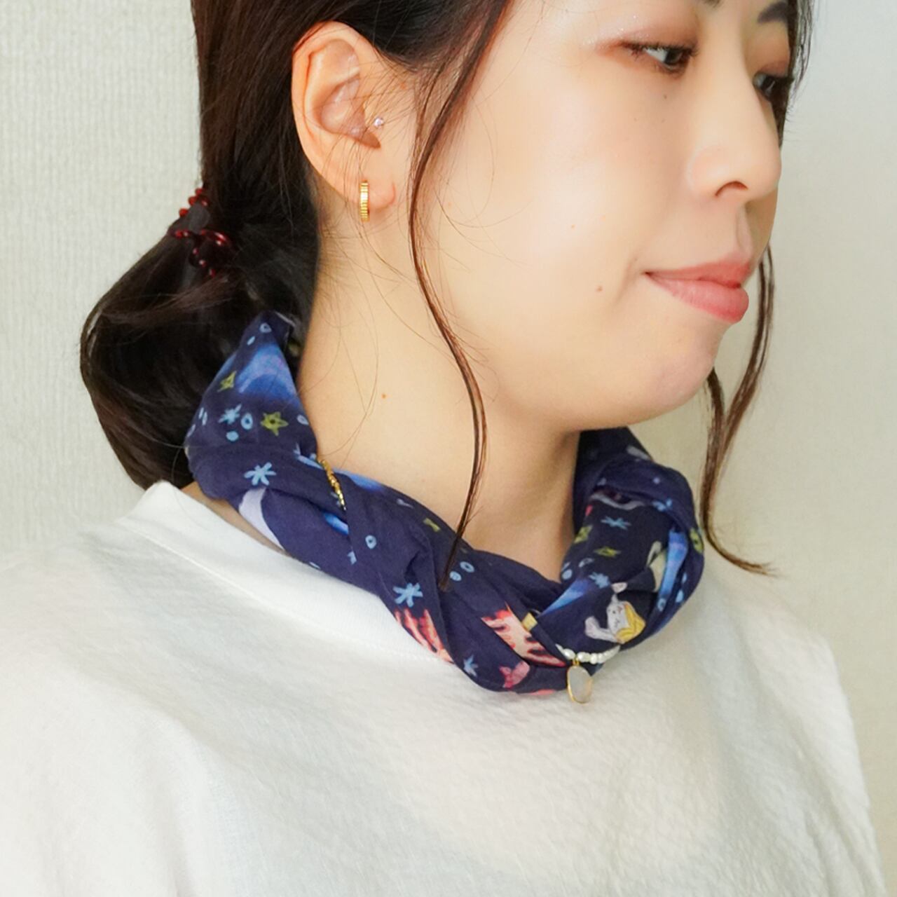 10年以上にわたりスカーフの企画に携わってきた経験を活かし、簡単に形が決まり、真夏でも重たくならず、首元の汗対策にもなるハンカチスカーフを作りました。